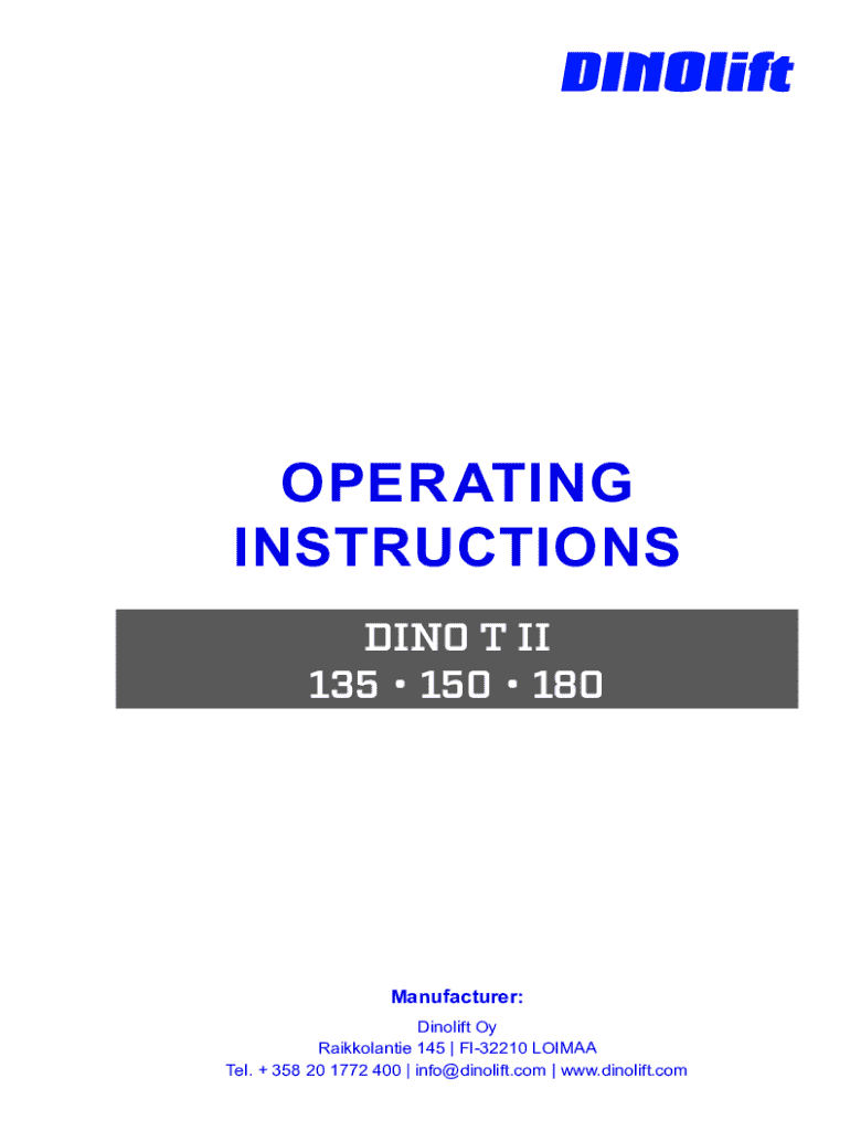 OPERATING INSTRUCTIONS DINO T II 135150180Manufacturer: Dinolift Oy Raikkolantie 145 | FI32210 LOIMAA Tel. + 358 20 1772 400 | info@dinolift.com | www.dinolift.comORIGINAL OPERATING INSTRUCTIONS Valid