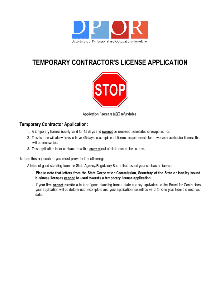 TEMPORARY CONTRACTOR\'S LICENSE APPLICATIONApplication Fees are NOT refundable.Temporary Contractor Application: 1. A temporary license is only valid for 45 days and cannot be renewed, reinstated