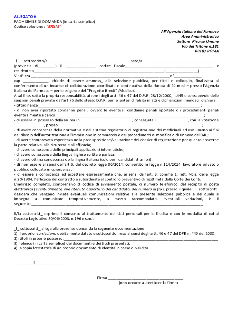 Ottieni il gratuito ALLEGATO A - FACSIMILE DI DOMANDA (in carta semplice. Codice