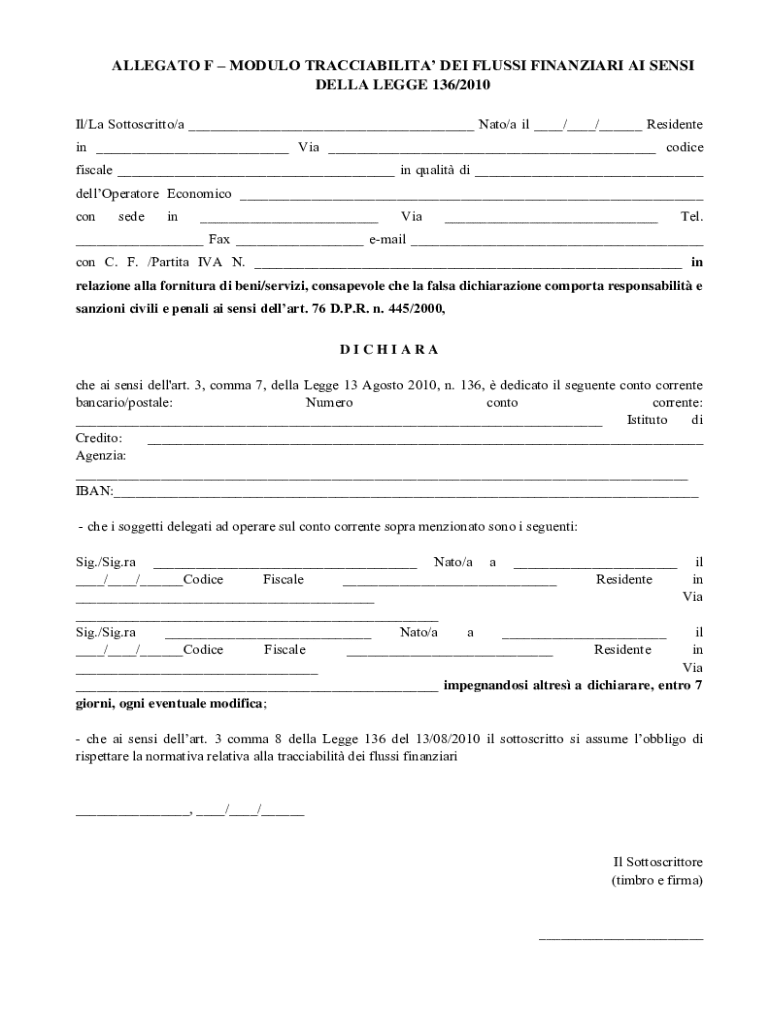 Ottieni il gratuito MODULO TRACCIABILITA' DEI FLUSSI FINANZIARI AI SENSI ...