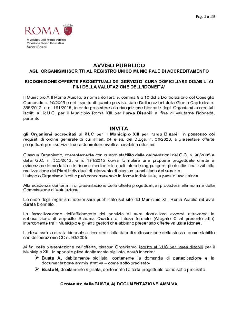 Pag. 1 a 18Municipio XIII Roma Aurelio Direzione Socio Educativa Servizi SocialiAVVISO PUBBLICO AGLI ORGANISMI ISCRITTI AL REGISTRO UNICO MUNICIPALE DI ACCREDITAMENTO RICOGNIZIONE OFFERTE PROGETTUALI