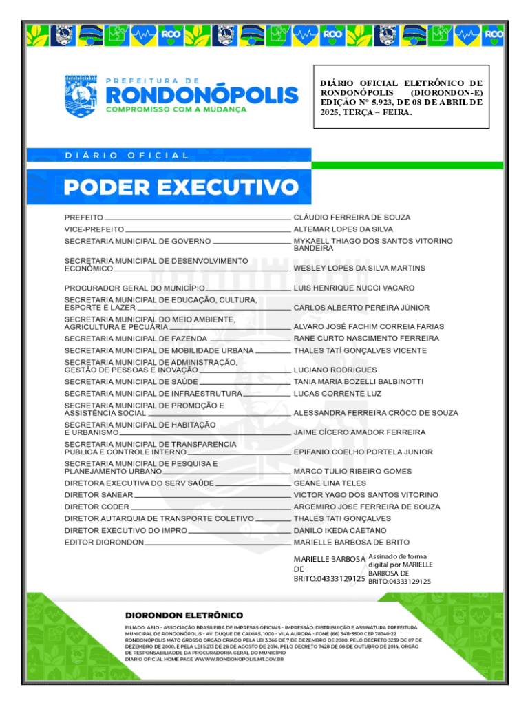 DIRIO OFICIAL ELETRNICO DE RONDONPOLIS (DIORONDONE) EDIO N 5.923, DE 08 DE ABRIL DE 2025, TERAFEIRA.MARIELLE BARBOSA Assinado de forma digital por MARIELLE DE BARBOSA DE BRITO:04333129125 BRITO:04333129125DIRIO
