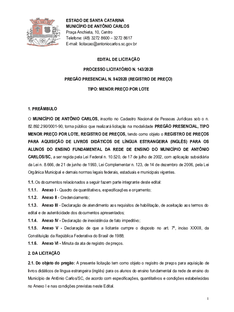 Obtenha o gratuito licitacaoantoniocarlos.sc.gov.br EDITAL DE LICITA