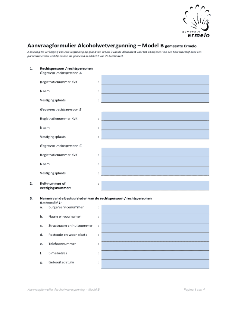 Aanvraagformulier AlcoholwetvergunningModel B gemeente Ermelo Aanvraag ter verkrijging van een vergunning op grond van artikel 3 van de Alcoholwet voor het uitoefenen van een horecabedrijf door een