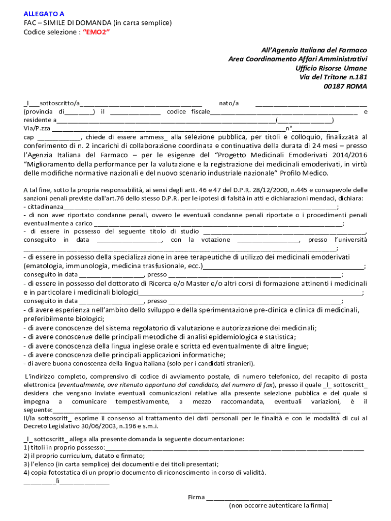 Ottieni il gratuito Allegato A - Fac Simile Domanda EMO2