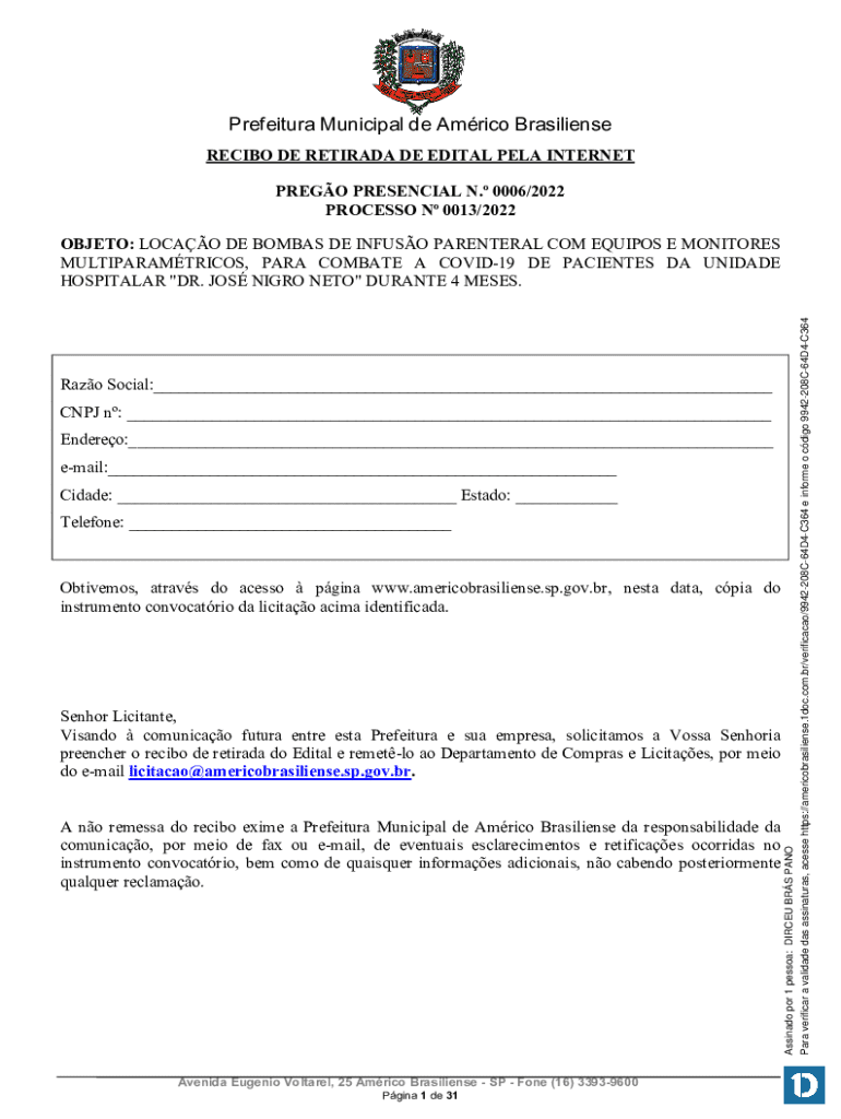 Prefeitura Municipal de Amrico Brasiliense RECIBO DE RETIRADA DE EDITAL PELA INTERNET PREGO PRESENCIAL N. 0006/2022 PROCESSO N 0013/2022Razo Social:___ CNPJ n: ___ Endereo:___ email:___ Cidade: ___