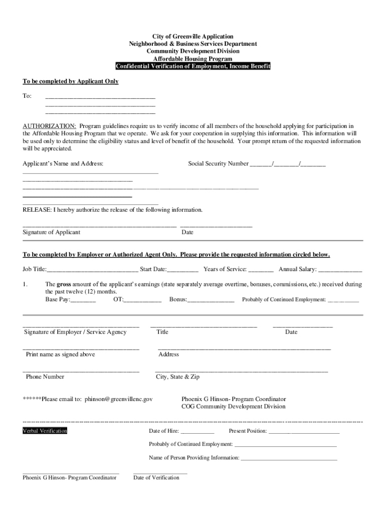 City of Greenville Application Neighborhood & Business Services Department Community Development Division Affordable Housing Program Confidential Verification of Employment, Income Benefit To be completed
