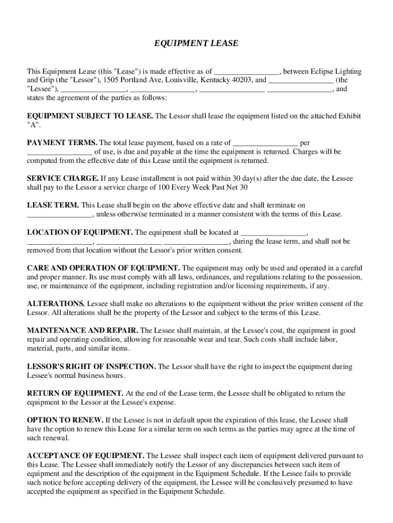 Get the free This Equipment Lease (this "Lease") is made effective as of , between Eclipse Lighting