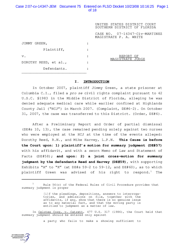 Case 2:07cv14347JEM Document 75 Entered on FLSD Docket 10/23/08 10:16:25 Page 1 of 18UNITED STATES DISTRICT COURT SOUTHERN DISTRICT OF FLORIDA CASE NO. 0714347CivMARTINEZ MAGISTRATE P. A. WHITE JIMMY