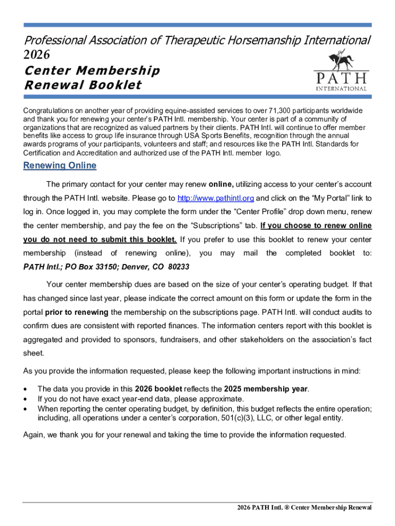 Professional Association of Therapeutic Horsemanship International 2026 Ce n te r M e m be r s h i p Re n e w a l B oo kl e t Congratulations on another year of providing equineassisted services to