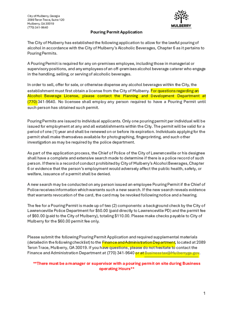 Get the free Pouring Permit Application The City of Mulberry has established the ...