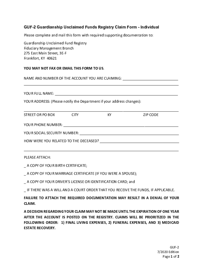 The GUF-2 form is a critical document designed for guardians to claim unclaimed funds on behalf of individuals under their care. This form serves multiple purposes, including facilitating access to financial resources and protecting the rights of the beneficiary. The legal implications are immense, as guardians must ensure that all claims made are legitimate, particularly when dealing with the estates and financial affairs of those who are unable to manage their own.