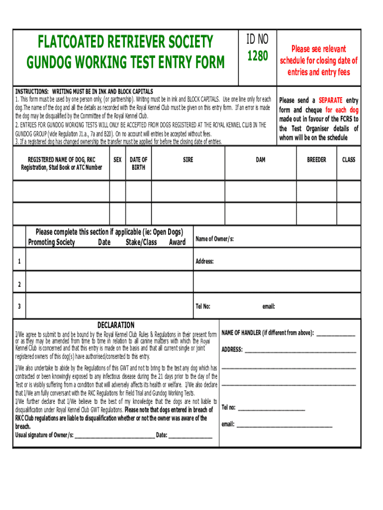FLATCOATED RETRIEVER SOCIETY GUNDOG WORKING TEST ENTRY FORMID NO 1280INSTRUCTIONS: WRITING MUST BE IN INK AND BLOCK CAPITALS 1. This form must be used by one person only, (or partnership). Writing