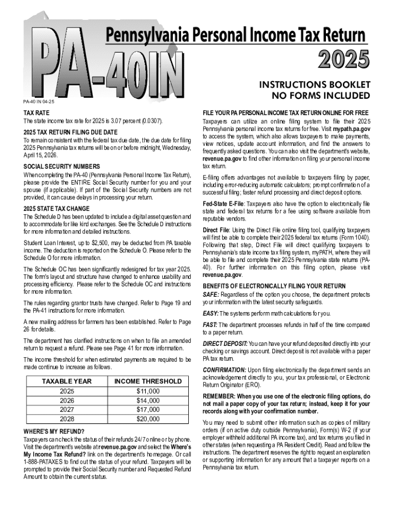 Get the free 2025 Pennsylvania Personal Income Tax Return Instructions (PA-40 IN). Forms/Publicat...