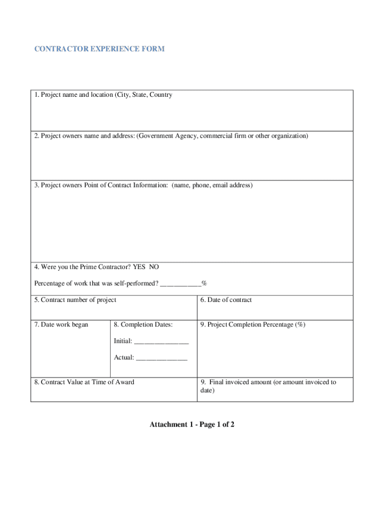 CONTRACTOR EXPERIENCE FORM1. Project name and location (City, State, Country2. Project owners name and address: (Government Agency, commercial firm or other organization)3. Project owners Point of