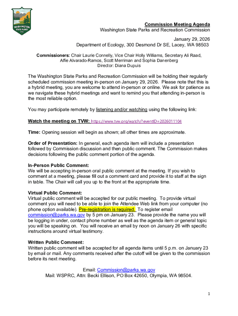 Commission Meeting Agenda Washington State Parks and Recreation Commission January 29, 2026 Department of Ecology, 300 Desmond Dr SE, Lacey, WA 98503 Commissioners: Chair Laurie Connelly, Vice Chair