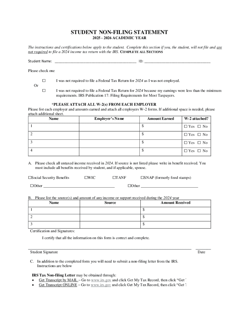 STUDENT NONFILING STATEMENT 20252026 ACADEMIC YEAR The instructions and certifications below apply to the student. Complete this section if you, the student, will not file and are not required to