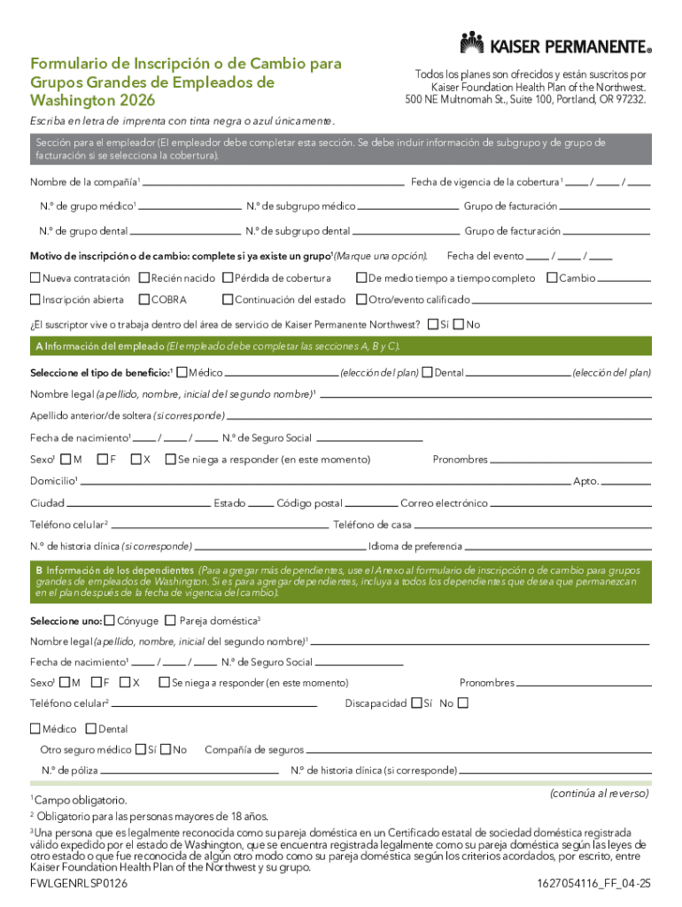 Obtener el gratis 2026 Washington Large Group Employee Enrollment/Change Form - SP