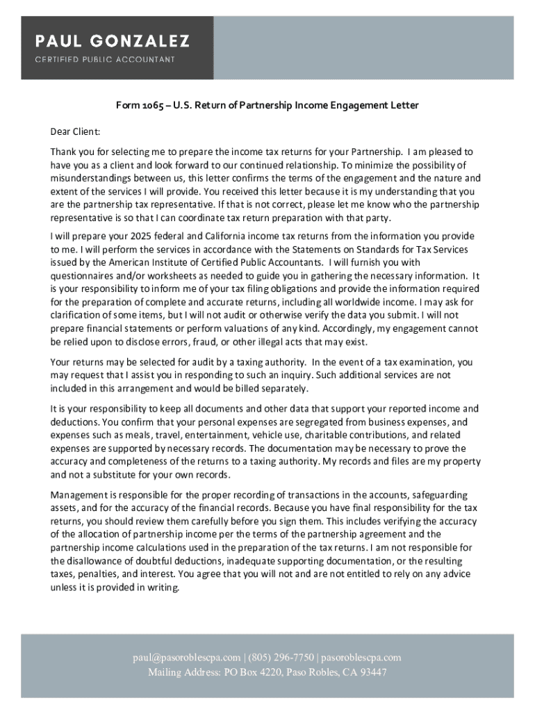 Get the free Form 1065 - Partnership Tax Return - Engagement Letter
