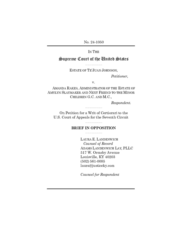 No. 241050 IN THESupreme Court of the United States ___ESTATE OF TEJUAN JOHNSON, Petitioner, v. AMANDA RAKES, ADMINISTRATOR OF THE ESTATE OF AMYLYN SLAYMAKER AND NEXT FRIEND TO THE MINOR CHILDREN
