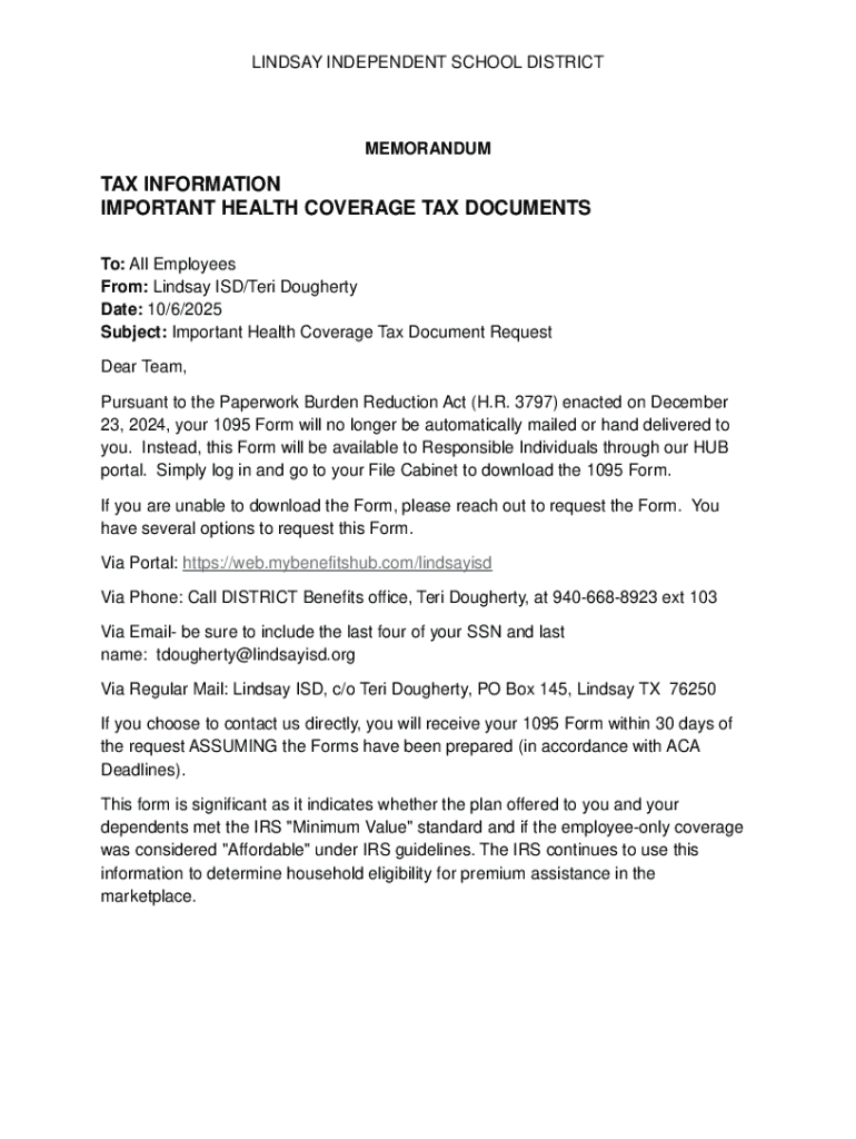LINDSAY INDEPENDENT SCHOOL DISTRICTMEMORANDUMTAX INFORMATION IMPORTANT HEALTH COVERAGE TAX DOCUMENTS To: All Employees From: Lindsay ISD/Teri Dougherty Date: 10/6/2025 Subject: Important Health Coverage