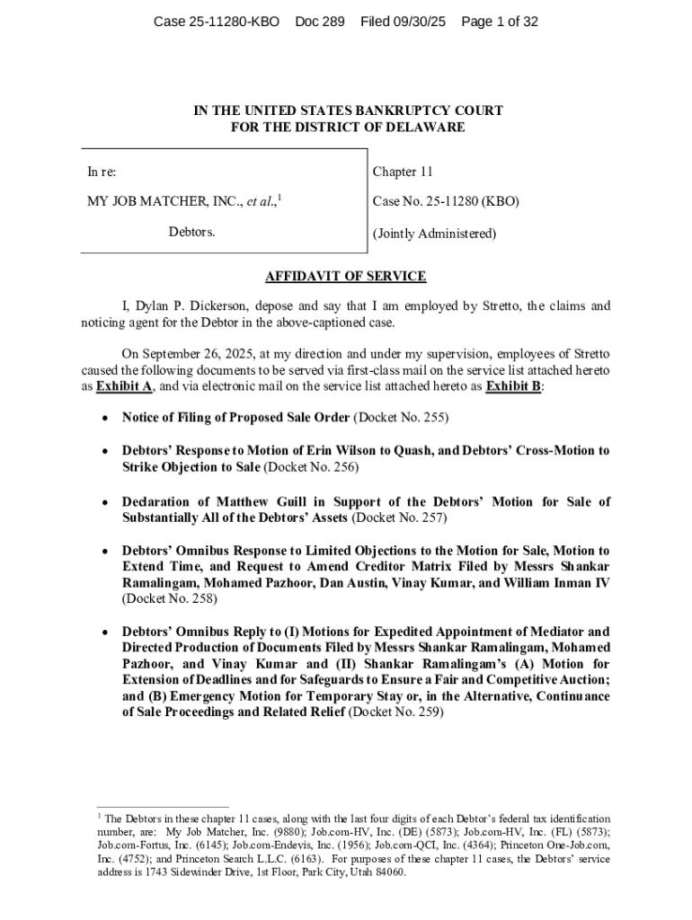Case 2511280KBODoc 289Filed 09/30/25Page 1 of 32IN THE UNITED STATES BANKRUPTCY COURT FOR THE DISTRICT OF DELAWARE In re:Chapter 11MY JOB MATCHER, INC., et al.,1Case No. 2511280 (KBO)Debtors.(Jointly