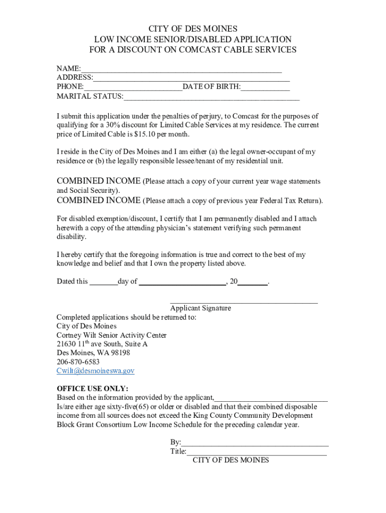 CITY OF DES MOINES LOW INCOME SENIOR/DISABLED APPLICATION FOR A DISCOUNT ON COMCAST CABLE SERVICES NAME:___ ADDRESS:___ PHONE:___DATE OF BIRTH:___ MARITAL STATUS:___ I submit this application under