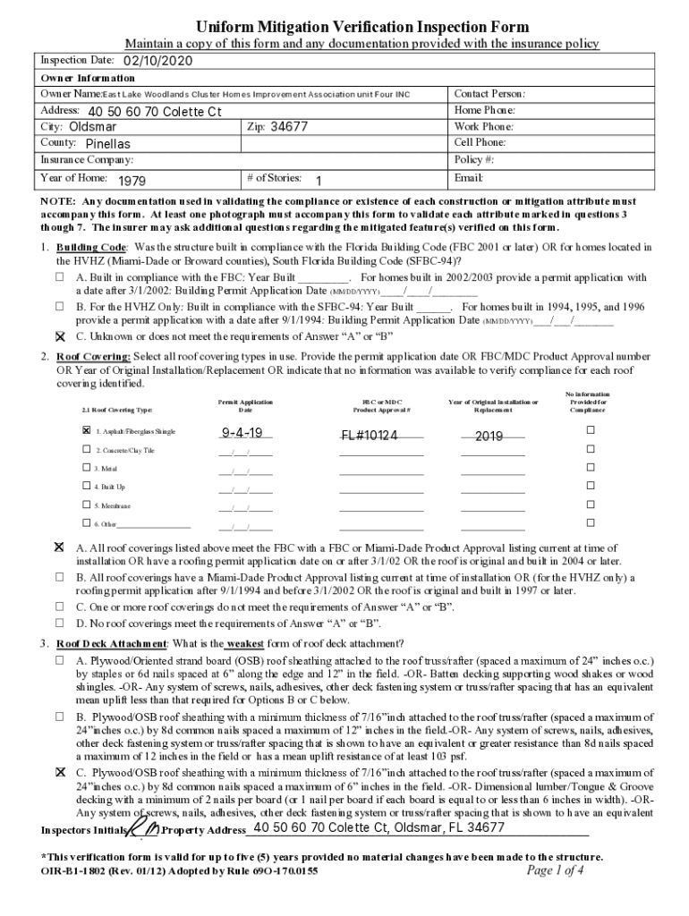 Uniform Mitigation Verification Inspection Form Maintain a copy of this form and any documentation provided with the insurance policy Inspection Date: 02/10/2020 Owner Information Owner Name:East