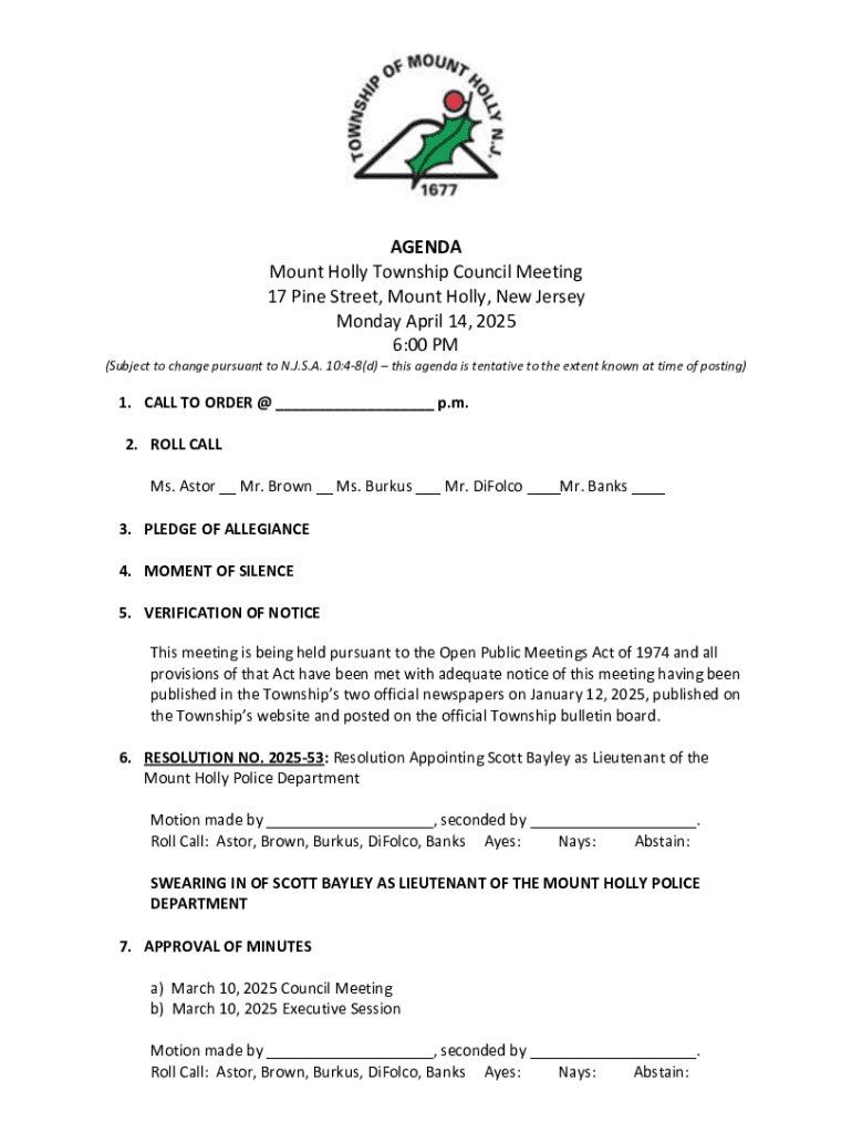 AGENDA Mount Holly Township Council Meeting 17 Pine Street, Mount Holly, New Jersey Monday April 14, 2025 6:00 PM (Subject to change pursuant to N.J.S.A. 10:48(d)this agenda is tentative to the extent