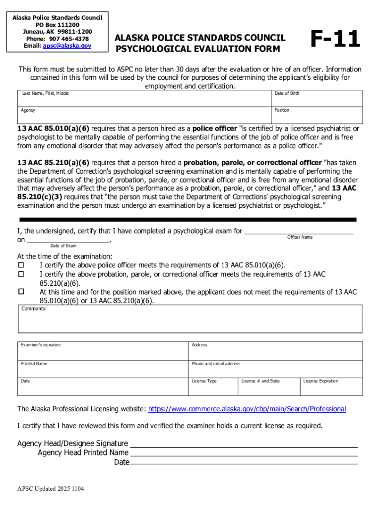 Alaska Police Standards Council PO Box 111200 Juneau, AK 998111200 Phone: 907 4654378 Email: apsc@alaska.govALASKA POLICE STANDARDS COUNCIL PSYCHOLOGICAL EVALUATION FORMF11This form must be submitted