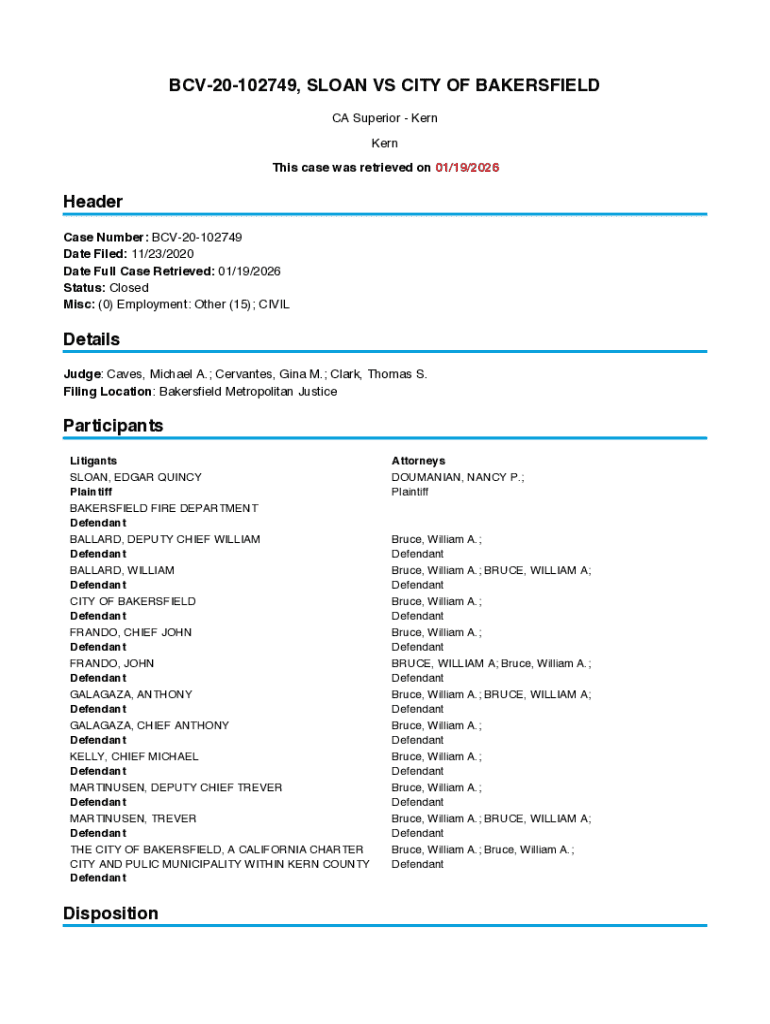 BCV20102749, SLOAN VS CITY OF BAKERSFIELD CA SuperiorKern Kern This case was retrieved on 01/19/2026Header Case Number: BCV20102749 Date Filed: 11/23/2020 Date Full Case Retrieved: 01/19/2026 Status: