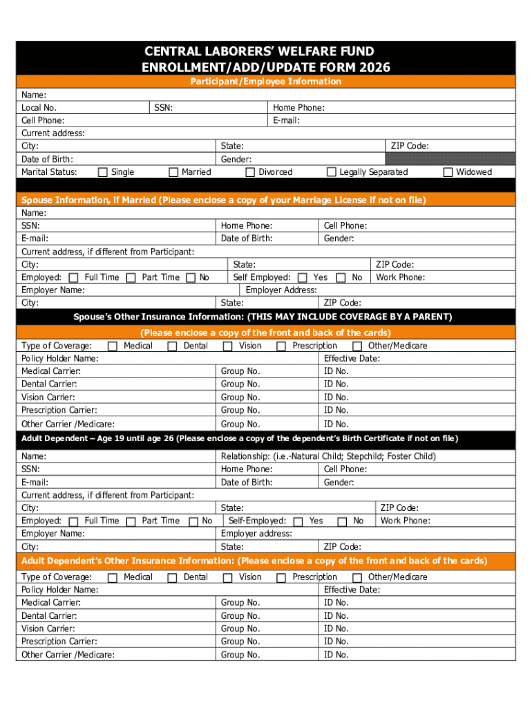 CENTRAL LABORERS WELFARE FUND ENROLLMENT/ADD/UPDATE FORM 2026 Participant/Employee InformationName: Local No. Cell Phone: Current address: City: Date of Birth: Marital Status:SSN:SingleHome Phone: