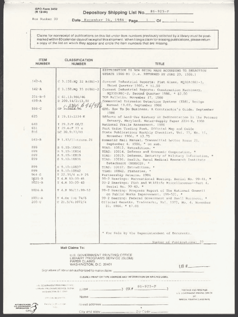 Get the free (R 12-84) Depository Shipping List No.86-925-F