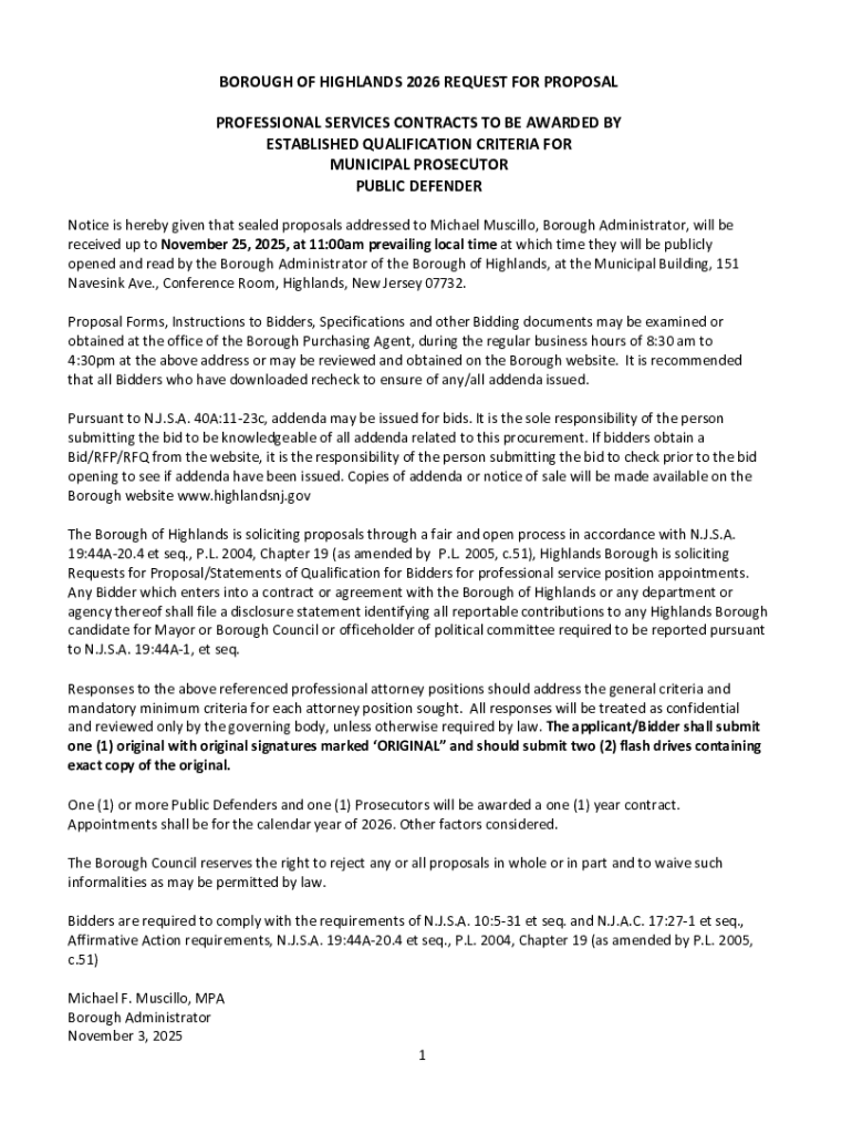 BOROUGH OF HIGHLANDS 2026 REQUEST FOR PROPOSAL PROFESSIONAL SERVICES CONTRACTS TO BE AWARDED BY ESTABLISHED QUALIFICATION CRITERIA FOR MUNICIPAL PROSECUTOR PUBLIC DEFENDER Notice is hereby given that