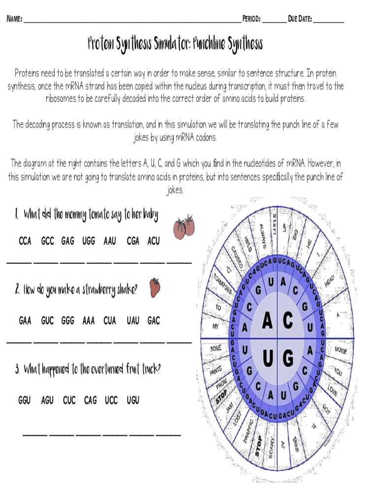 Name: ___ Period: ___ Due Date: ___Protein Synthesis Simulator: Punchline SynthesisProteins need to be translated a certain way in order to make sense, similar to sentence structure. In protein synthesis,