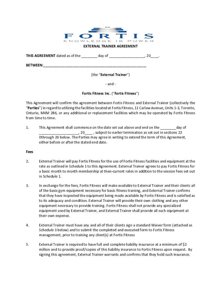 Drafting a gym external trainer agreement requires careful consideration of specific key components that will protect both the gym's interests and those of the trainer. Among the essential clauses that need to be included are: