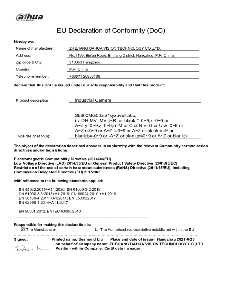 EU Declaration of Conformity (DoC) Hereby we, Name of manufacturer:ZHEJIANG DAHUA VISION TECHNOLOGY CO.,LTD.Address:No.1199, Bin\'an Road, Binjiang District, Hangzhou, P.R. ChinaZip code & City:310053