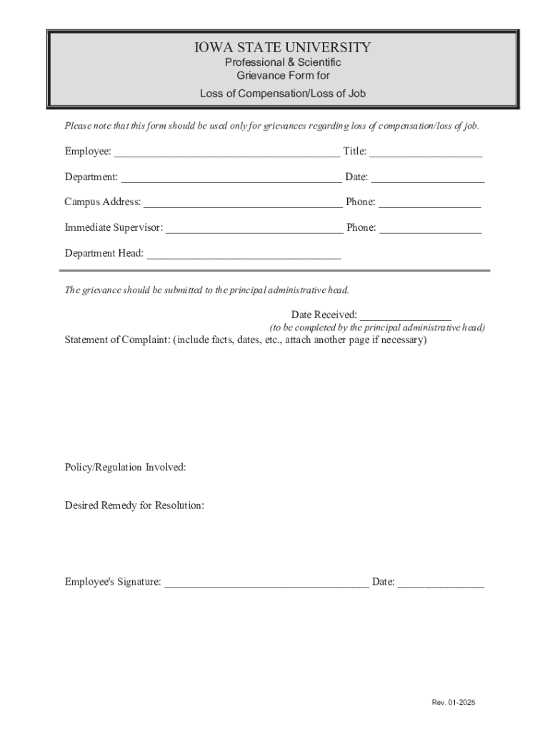 A grievance form serves as a formal document allowing individuals to report their complaints or concerns regarding a particular issue, such as workplace discrimination, harassment, or safety concerns. In Iowa, filing a grievance is not only a crucial step for voicing dissatisfaction but also a vital mechanism for initiating resolution processes.
