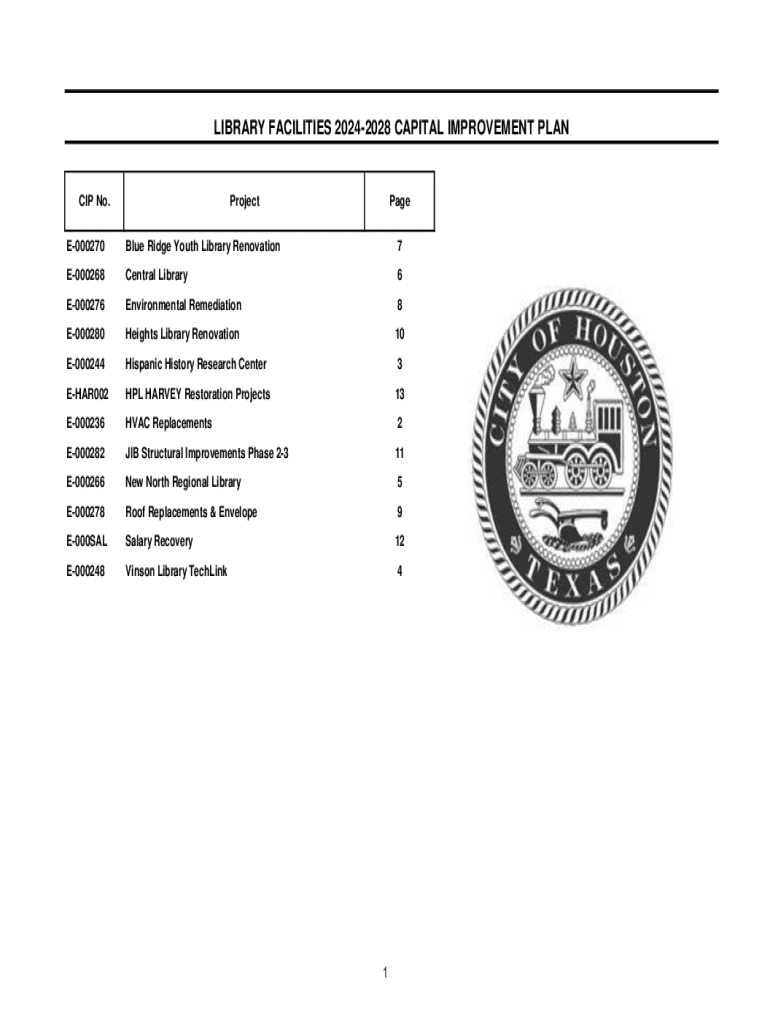 LIBRARY FACILITIES 20242028 CAPITAL IMPROVEMENT PLANCIP No.ProjectPageE000270Blue Ridge Youth Library Renovation7E000268Central Library6E000276Environmental Remediation8E000280Heights Library Renovation10E000244Hispanic