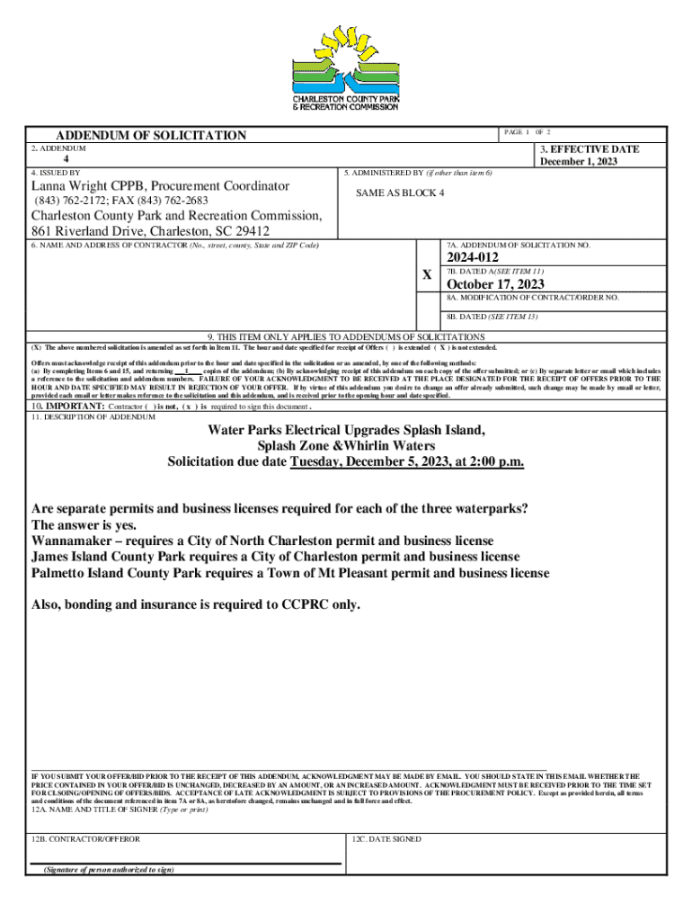 PAGE 1ADDENDUM OF SOLICITATION0F 22. ADDENDUM3. EFFECTIVE DATE December 1, 20234 4. ISSUED BY5. ADMINISTERED BY (if other than item 6)Lanna Wright CPPB, Procurement Coordinator (843) 7622172; FAX