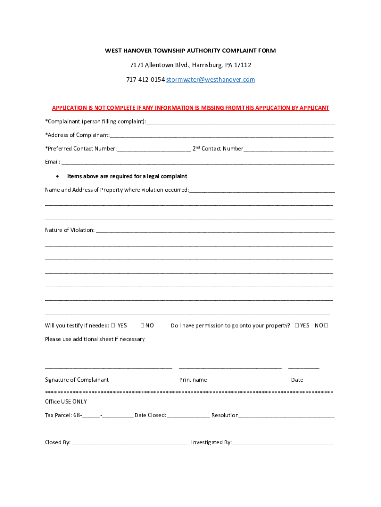 Get the free WEST HANOVER TOWNSHIP AUTHORITY COMPLAINT FORM ...