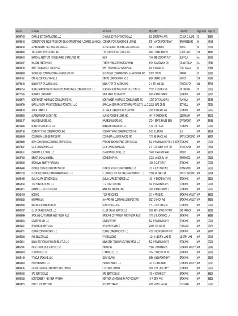 busubiLEnamefirmnamePhysaddr1PhysCityPhysStatePhysZip604957405CHARLIE BOY CONTRACTING LLCCHARLIE BOY CONTRACTING LLC920 E MONTANA AVECOEUR D ALENEID83814604966106CORNERSTONE INDUSTRIES CORP DBA CORNERSTONE