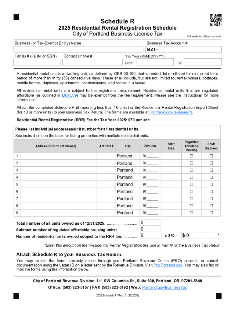 PrintResetSchedule R2025 Residential Rental Registration Schedule City of Portland Business License Tax Business (or TaxExempt Entity) NameQR code for official use onlyBusiness Tax Account #BZTTax