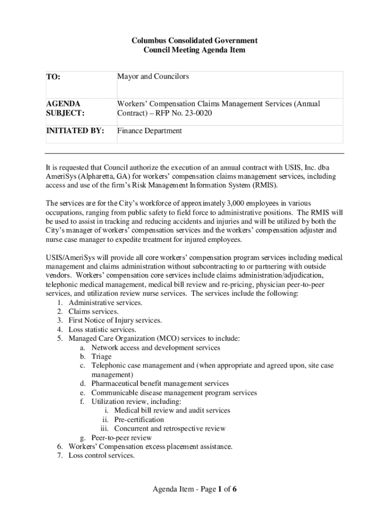 Columbus Consolidated Government Council Meeting Agenda Item TO:Mayor and CouncilorsAGENDA SUBJECT:Workers Compensation Claims Management Services (Annual Contract)RFP No. 230020INITIATED BY:Finance