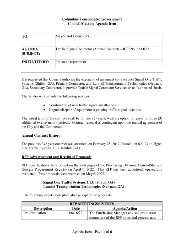 Columbus Consolidated Government Council Meeting Agenda Item TO:Mayor and CouncilorsAGENDA SUBJECT:Traffic Signal Contractor (Annual Contract)RFP No. 220020INITIATED BY:Finance DepartmentIt is requested