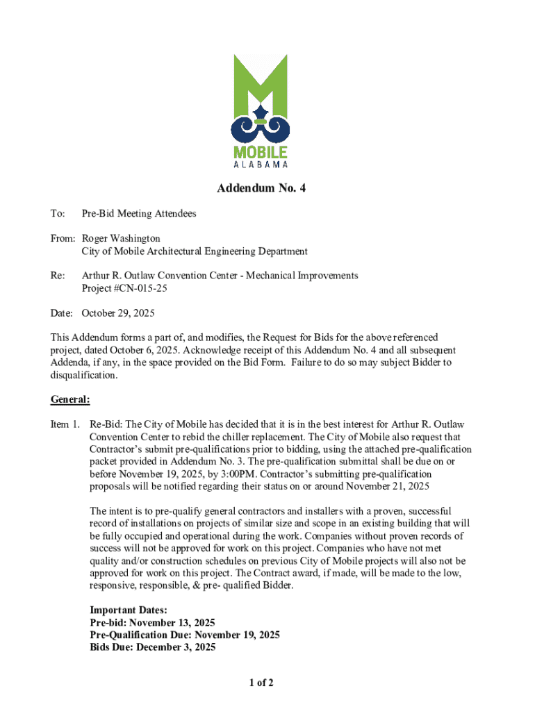 Addendum No. 4 To:PreBid Meeting AttendeesFrom: Roger Washington City of Mobile Architectural Engineering Department Re:Arthur R. Outlaw Convention CenterMechanical Improvements Project #CN01525Date: