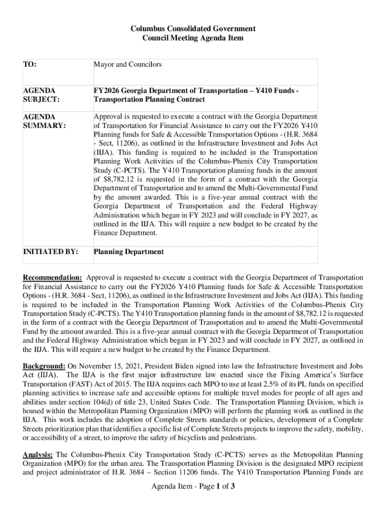 Columbus Consolidated Government Council Meeting Agenda Item TO:Mayor and CouncilorsAGENDA SUBJECT:FY2026 Georgia Department of TransportationY410 Funds Transportation Planning ContractAGENDA SUMMARY:Approval