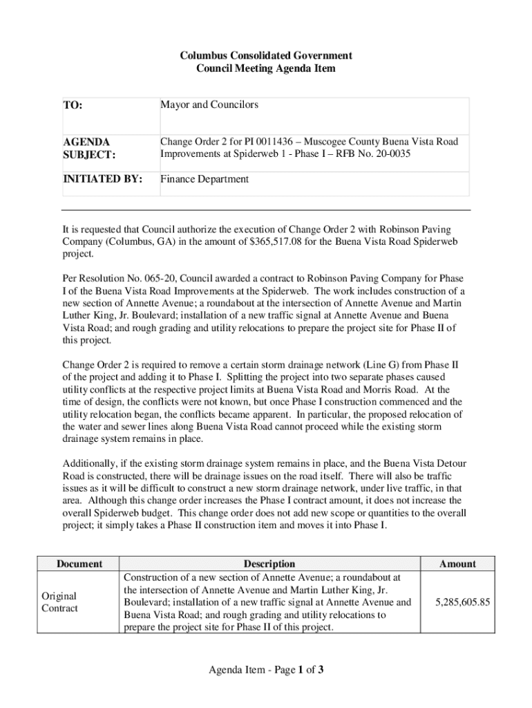 Get the free Change Order 2 for PI 0011436 Muscogee County Buena Vista Road