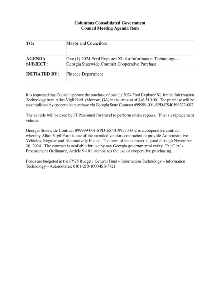 Columbus Consolidated Government Council Meeting Agenda Item TO:Mayor and CouncilorsAGENDA SUBJECT:One (1) 2024 Ford Explorer XL for Information TechnologyGeorgia Statewide Contract Cooperative PurchaseINITIATED