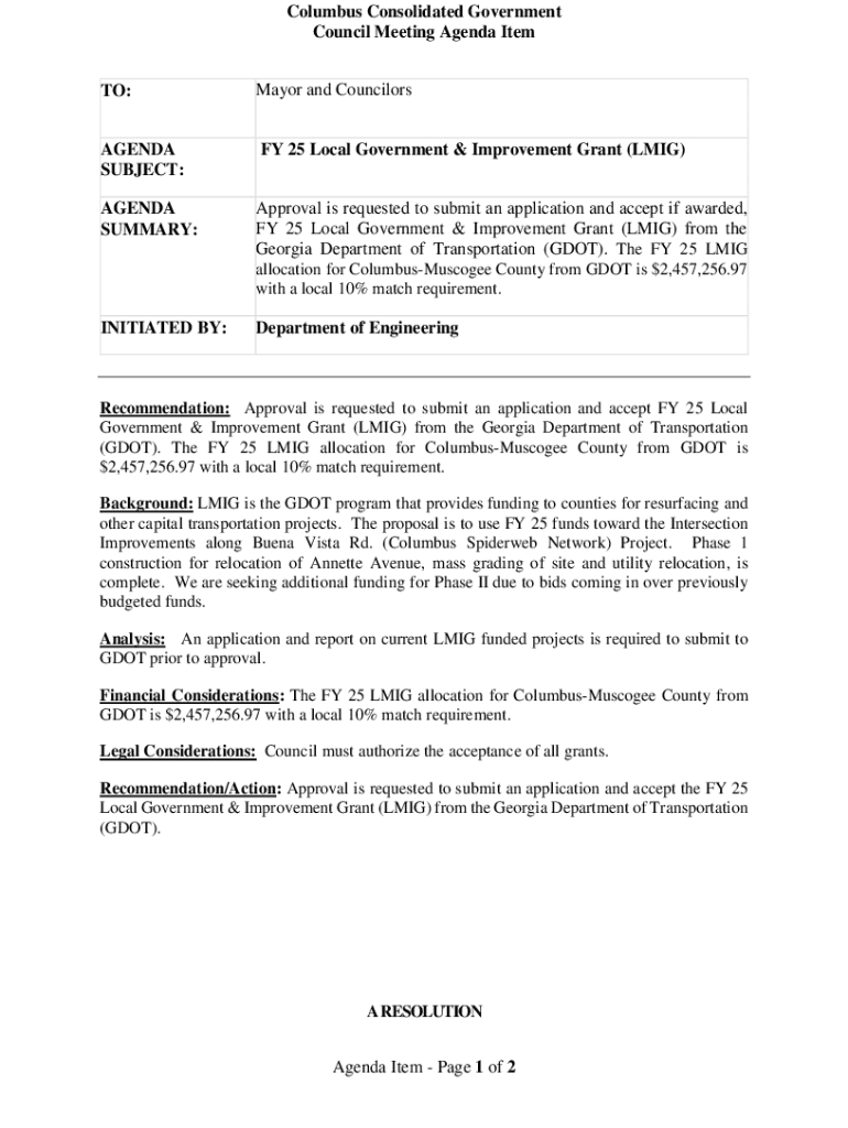 Columbus Consolidated Government Council Meeting Agenda Item TO:Mayor and CouncilorsAGENDA SUBJECT:FY 25 Local Government & Improvement Grant (LMIG)AGENDA SUMMARY:Approval is requested to submit an